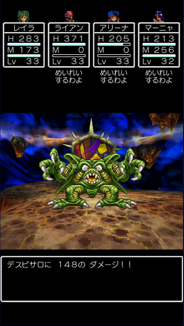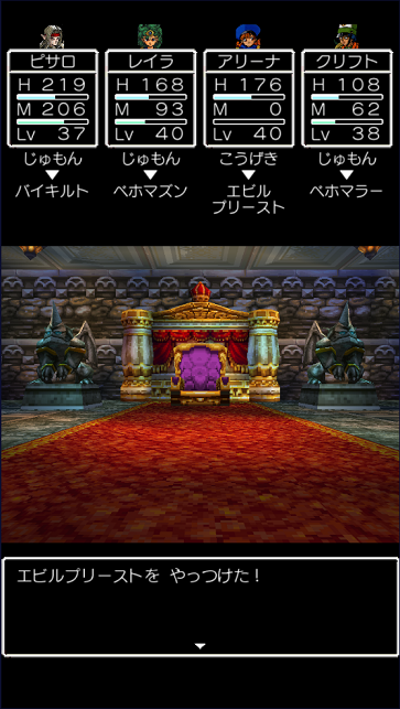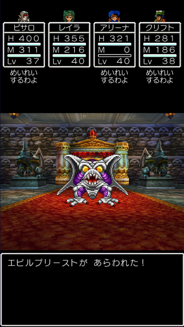 第六章最後の敵はデスパレスにいる進化の秘宝を使ったエビルプリーストです。馬車は乗り込めないため四人を代表して戦わなければなりません。デスピサロ、主人公、アリーナ、クリフトを選びました。主人公にはぐれメタルの剣を装備させ、フバーハは無しで戦います。
