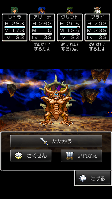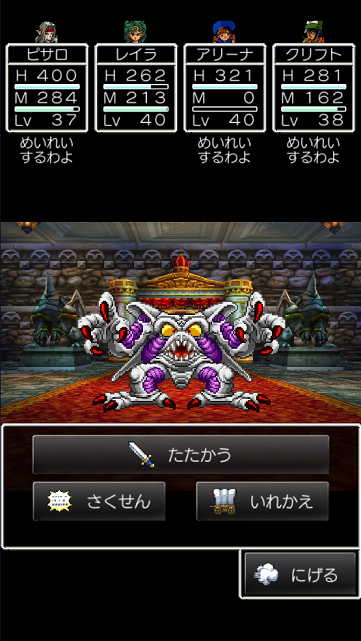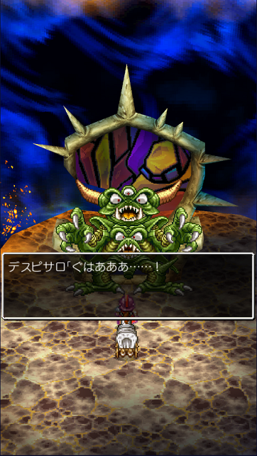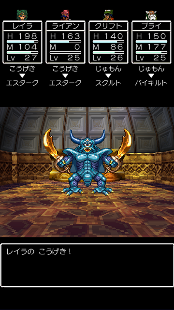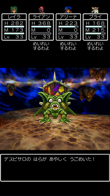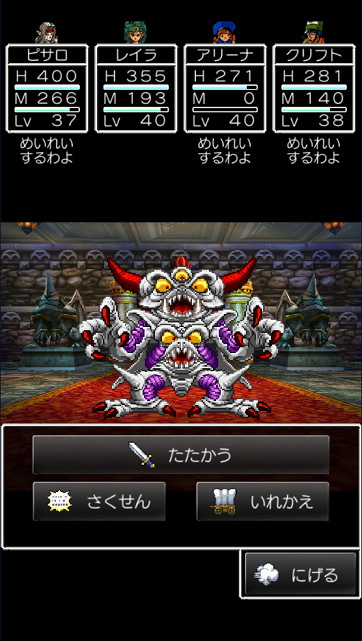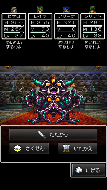 デスピサロの色違いです。エッグラチキーラ戦と同様、デスピサロのバイキルトでアリーナと主人公の攻撃力を倍にし叩かせて、クリフトはスクルトベホマラー、ザオリクで守備に専念させます。主人公のベホマズンもかなり活躍します。
