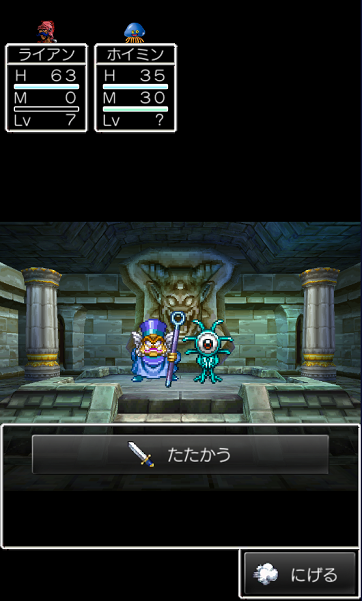 古井戸で見つけた空飛ぶ靴で湖の塔へ行きます。ここではこの章のボスピサロの手先と大目玉と戦闘になります。ピサロの手先は炎とギラで攻撃してきますが、ホイミスライムはどちらにも耐性がありHPが少なくなるとホイミを唱えてくれるのでたのもしいです。塔にある破邪の剣を装備させレベル7で倒せました。