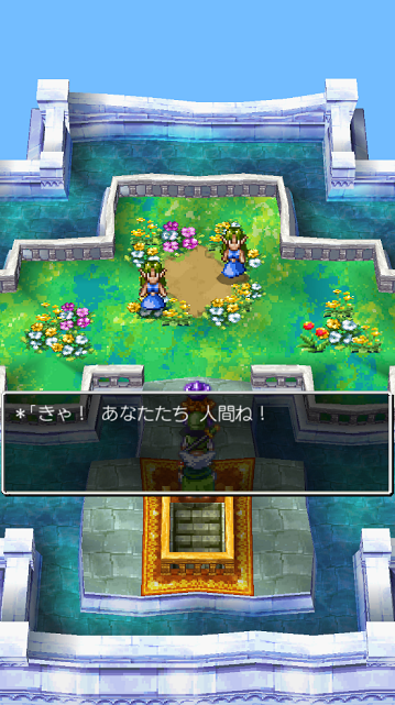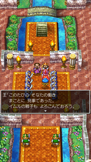 更に南に向かい砂漠のバザーに行きますと、そこにいたサントハイムの兵士からお城に一旦戻られるように言われます。戻ってみたら王様は声が出ません。これを直すため、さえずりの塔にさえずりの密を求めに行きます。塔のてっぺんにはエルフがいて、さえずりの密を落としていきます。これで王様の声を直して、東の祠からエンドールへ向かう許可を得ます。