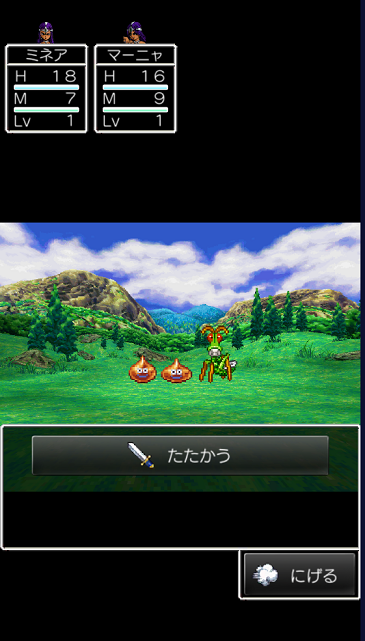 最初の戦闘です。ミネアはそこそこ戦闘で使え、マーニャはメラが使えますので見た目ほど弱くはありません。