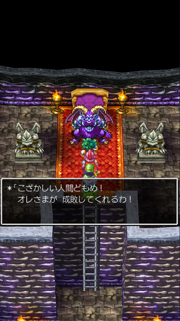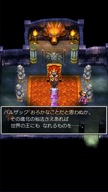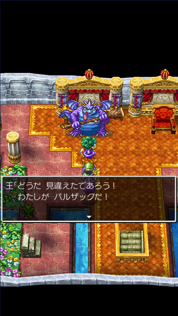 キングレオの城の大臣がバルザックはサントハイムに向かったとのことで早速行ってみますと、バルザックは我が物顔で玉座にいました。進化の秘宝で姿を変えたバルザックは攻撃力は強くなっていたもののスクルトで十分対策でき余裕で勝てました。サントハイムにあったあやかしの笛とマグマの杖を手に入れました。