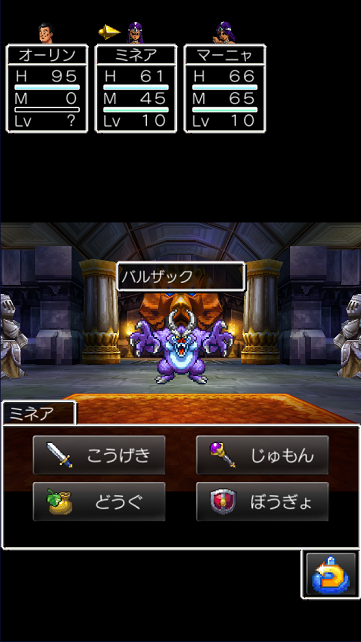 バルザックは強いです。特にベホマを使ってきますので洞窟で見つけた静寂の球を使って魔法を封じ込めます。ラリホーは効きませんでしたがルカニが効きますので守備力を下げ、後はオーリンに叩かせれば勝てます。