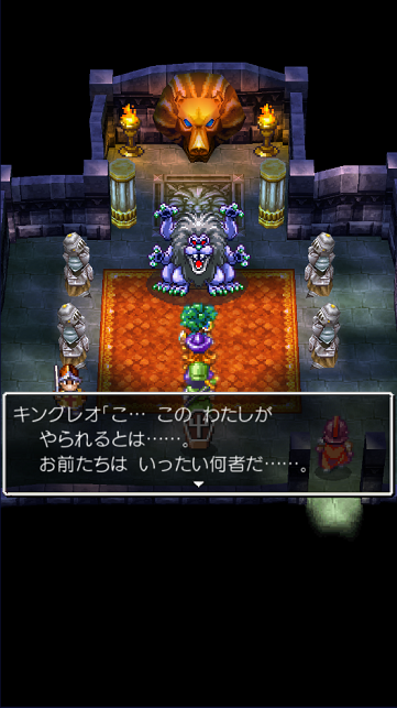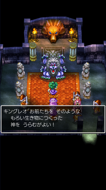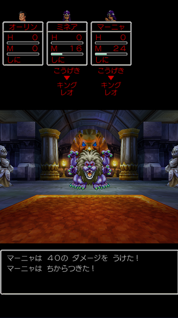 漸くキングレオに勝てました。キングレオは通常攻撃、ギラ、凍える吹雪の中から2回攻撃をしてきます。通常攻撃はスクルト、ギラはマホトーンで対策できますが、凍える吹雪だけは対策ができずその都度ベホイミで回復させていました。クリフトはそれらの呪文を使えるため必須で、他にアリーナとマーニャのメラミで戦いましたが、マーニャは死にました。ベホマラーのような集団回復呪文が無いのとフバーハを覚えていないため、凍える吹雪に脆弱だったのが苦戦する原因でした。以下キングレオを倒してから冒険が一気に進みました。