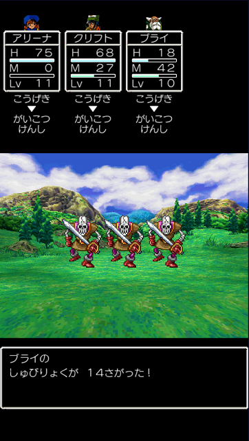 この大陸で出てくるがいこつけんしは強かったです。呪文は効かないし攻撃力がある上ルカナンまで使ってくるので要注意です。