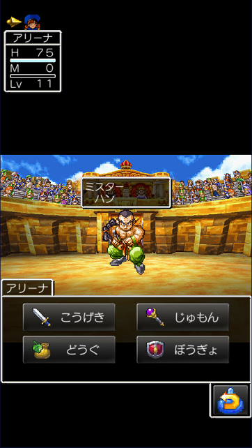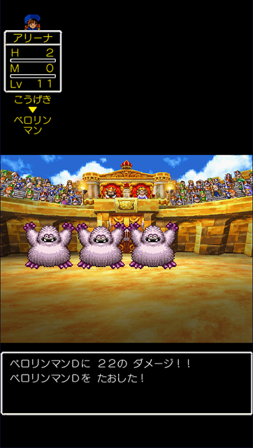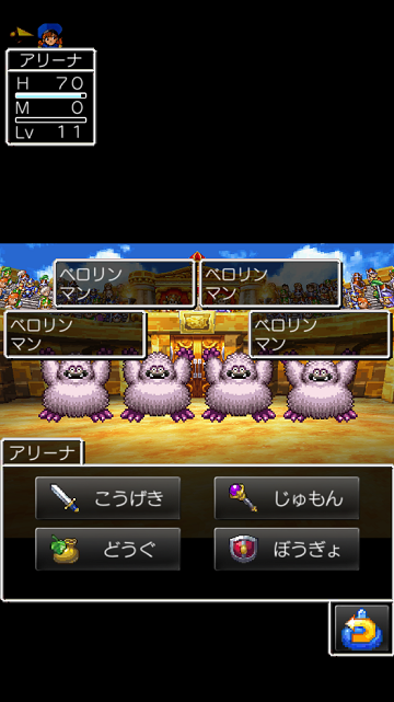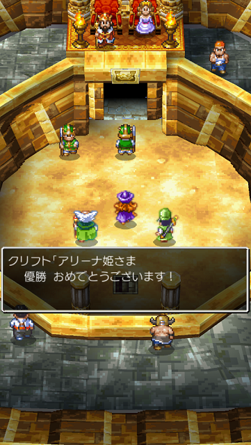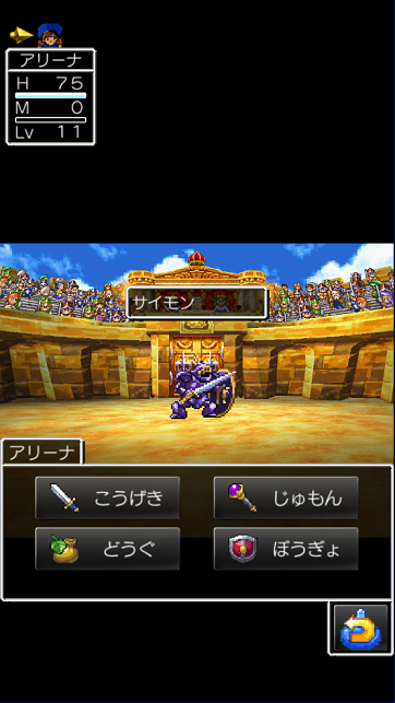 エンドールの武道大会はアリーナ一人で5人を倒さなければなりません。鉄の爪を装備させ薬草を命一杯持って挑みます。この戦いでホイミのような回復呪文が如何に有難いかがわかります。クリフトのホイミは使えません。
