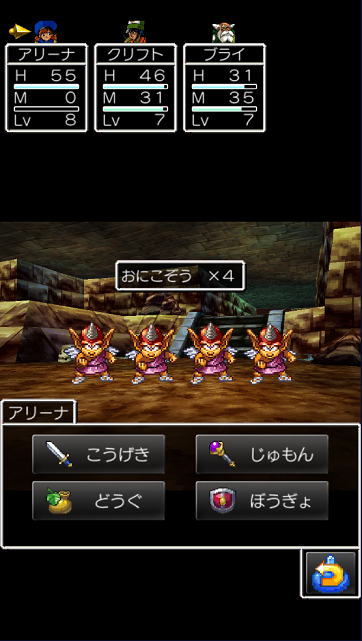 フレノールで偽アリーナ姫の誘拐犯と取引をするため南の洞窟に黄金の腕輪を取りに行きます。ここでおばけきのことおにこぞうが集団で出てくるのは地味に強かったです。おにこぞうにはマヌーサが効きます。おにこぞうはMPが足りないのにマヌーサを使うという変わったところもありますが、打撃が地味に効いてきます。