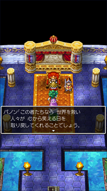 スタンシアラでは王様を笑わすと褒美が貰えるようで、モンバーバラに戻って旅芸人パノンを連れてきました。そこでのパノンのセリフが感動的でした。王様はこれに答えて天空の鎧をくれます。