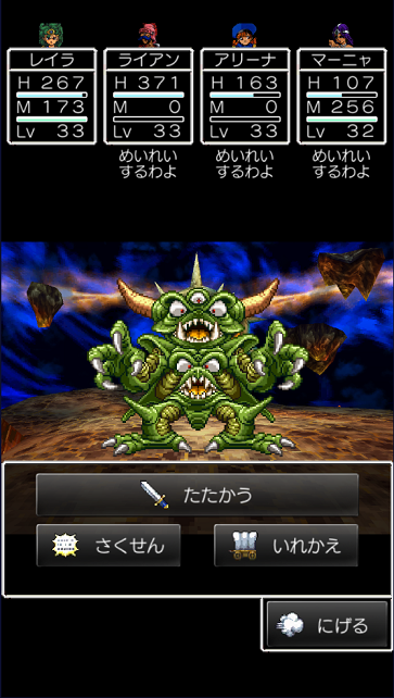 最初のメンバーはアリーナチームをそのまま入れました。主人公とアリーナの攻撃力、クリフトのスクルト、ベホマラー、ザオリク、ブライのバイキルト、ルカニが頼りです。途中でミネアを入れてフバーハもかけました。