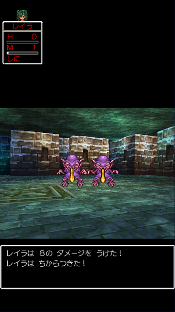 南へ向かうのに砂漠を突っ切って行かねばならず馬車が欲しいところですが持ち主のホフマンは強力してくれません。そこで原因の仲間に裏切られたという洞窟へ行ってみました。そこで一人になります。レイラ一人でベロベロ2体と戦うイベントは意外なほど難関で3回も死にました。ここで初めて全滅を経験しました。一人だとザコ2匹でも手こずるもんだと感心しました。ベロベロはマヌーサを使うため、混乱したらメラで攻撃するのが盲点でした。